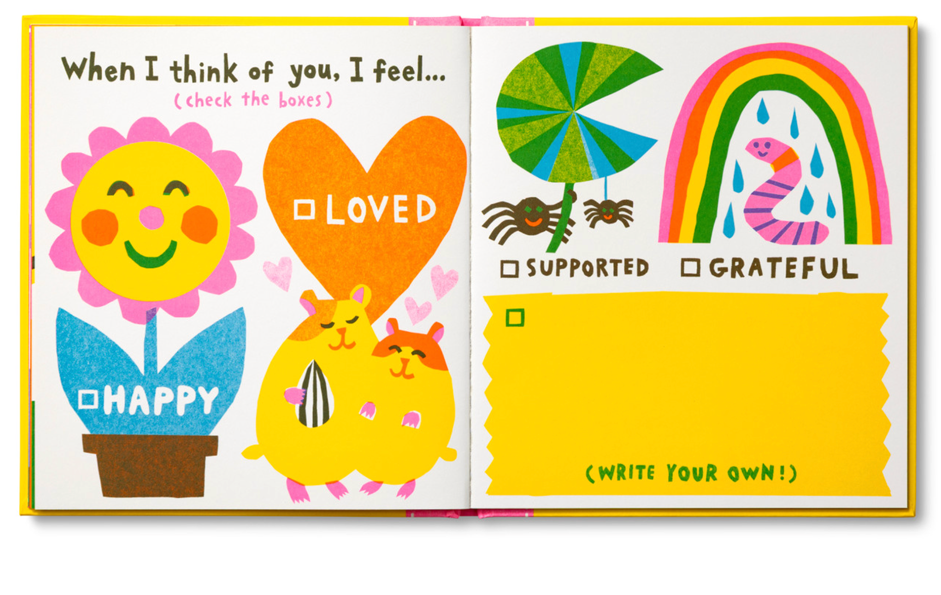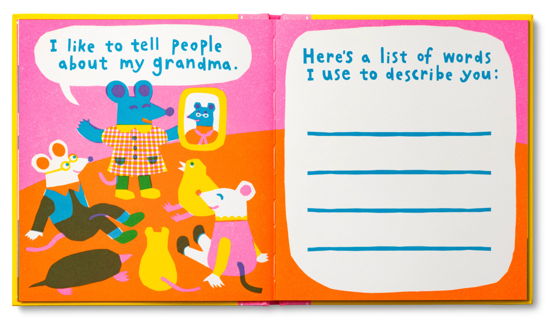 I designed and illustrated a series of interactive books called Grandma, I Made You A Book and Grandpa, I Made You A Book. These 32 pages books allow kids to draw, check off boxes, and make lists, all while celebrating what they love most about their grandma and/or grandpa. Once finished, parents have a special keepsake that reflects their child's unique personality and heartfelt love. The prompts are ideal for children ages 7 and older.